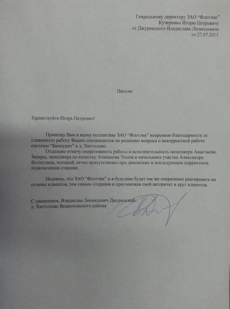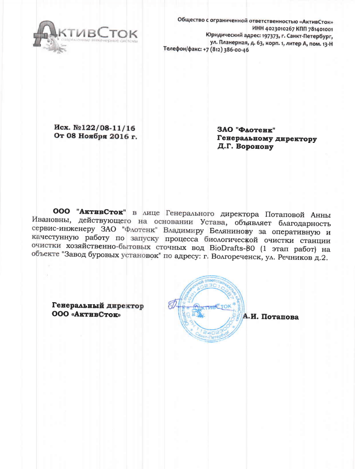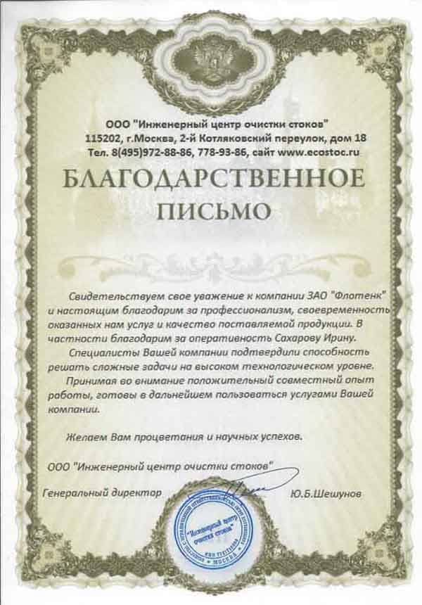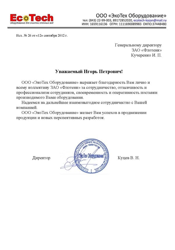 Рекомендательное письмо ООО "ЭкоТех Оборудование"
