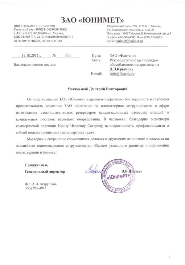 Рекомендательное письмо ЗАО "ЮНИМЕТ"