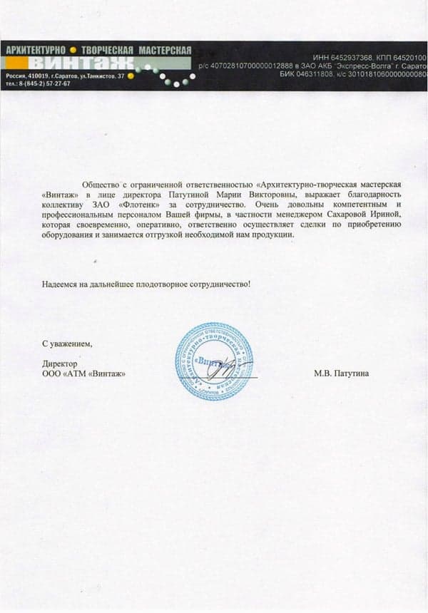 Рекомендательное письмо ООО "АТМ Винтаж"