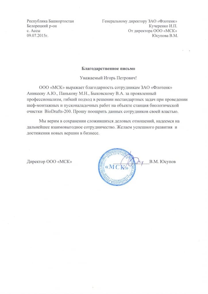 Рекомендательное письмо ООО "МСК"