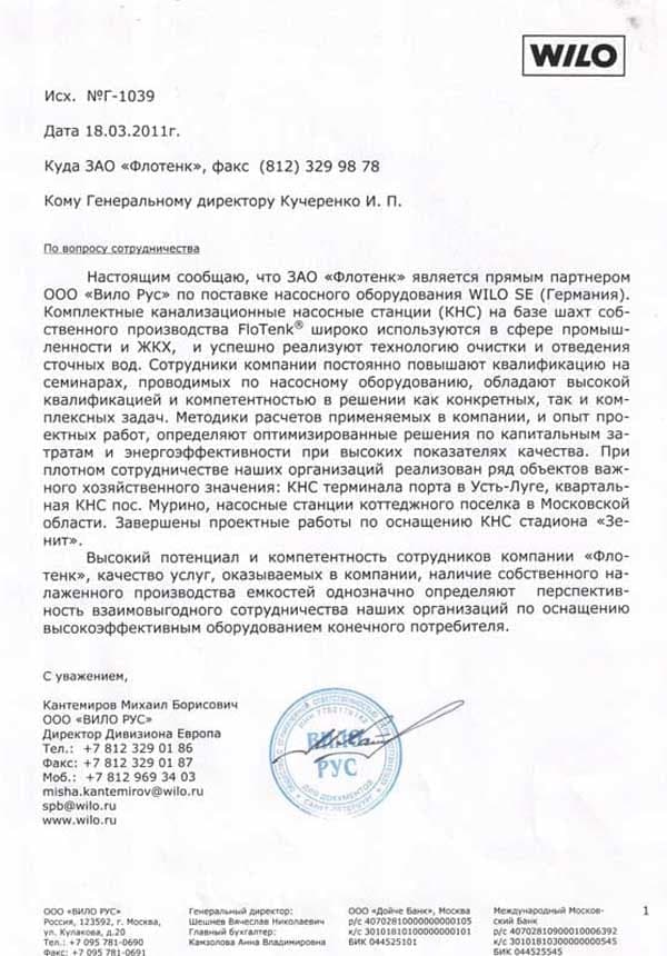 Рекомендательное письмо ООО "ВИЛО РУС"