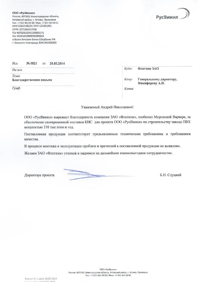 Рекомендательное письмо ООО "РусВинил"