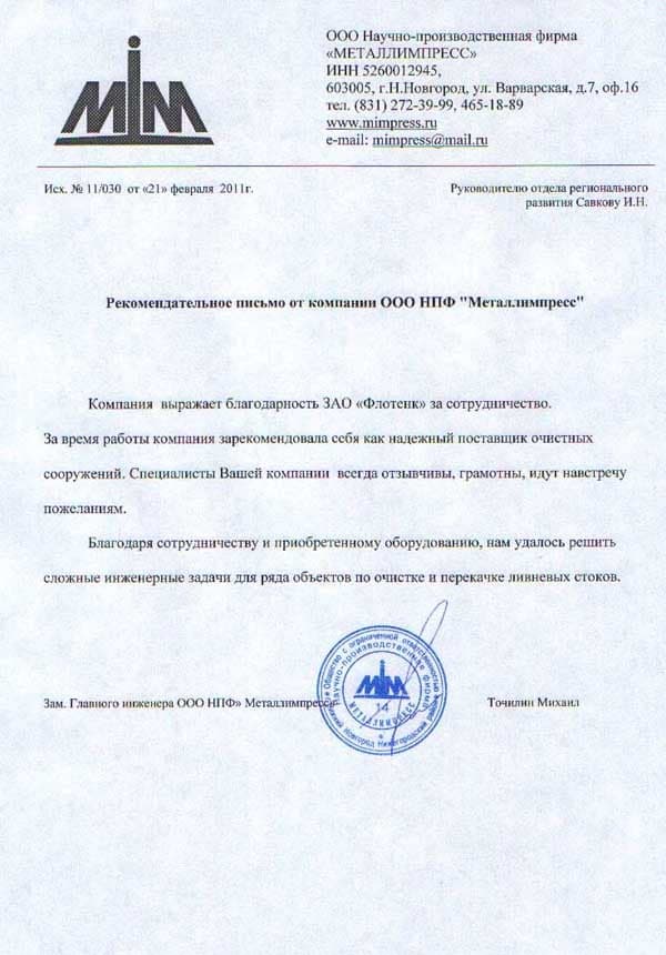 Рекомендательное письмо ЗАО НПФ "Металлимпресс"
