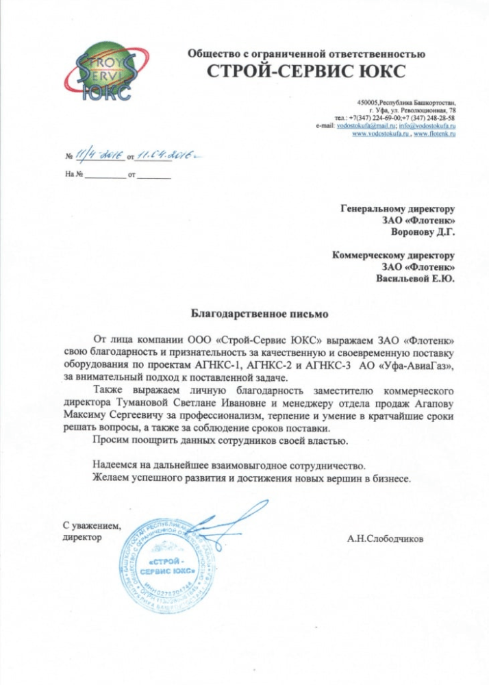 Рекомендательное письмо ООО "Строй-Сервис ЮКС"
