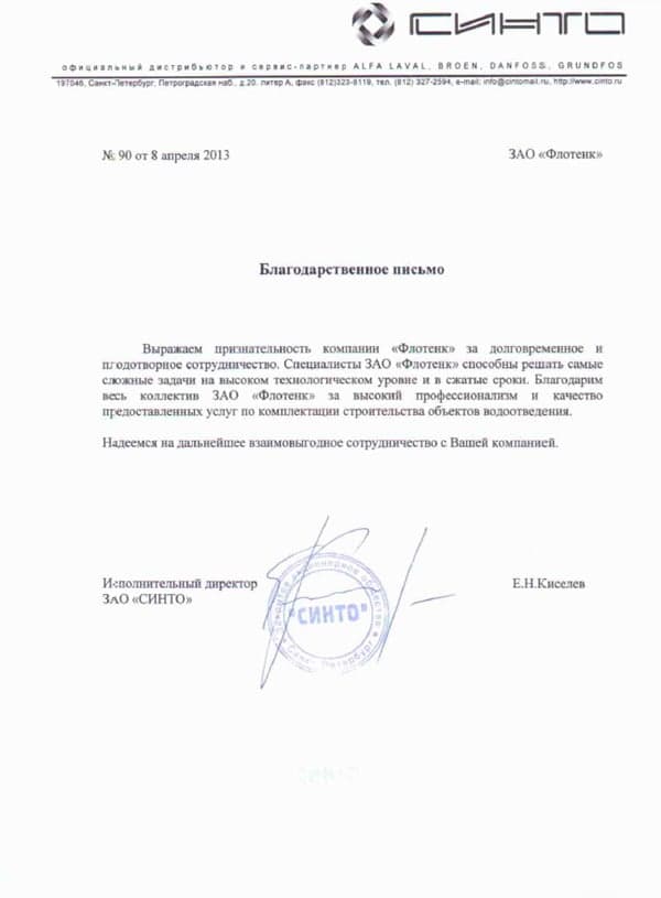 Рекомендательное письмо ЗАО "СИНТО"