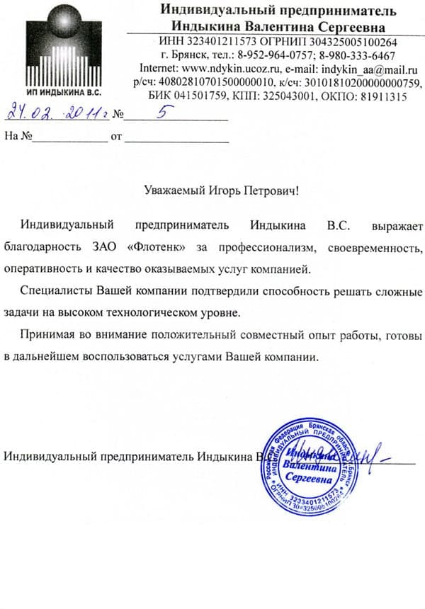 Рекомендательное письмо ИП "Индыкина В.С."