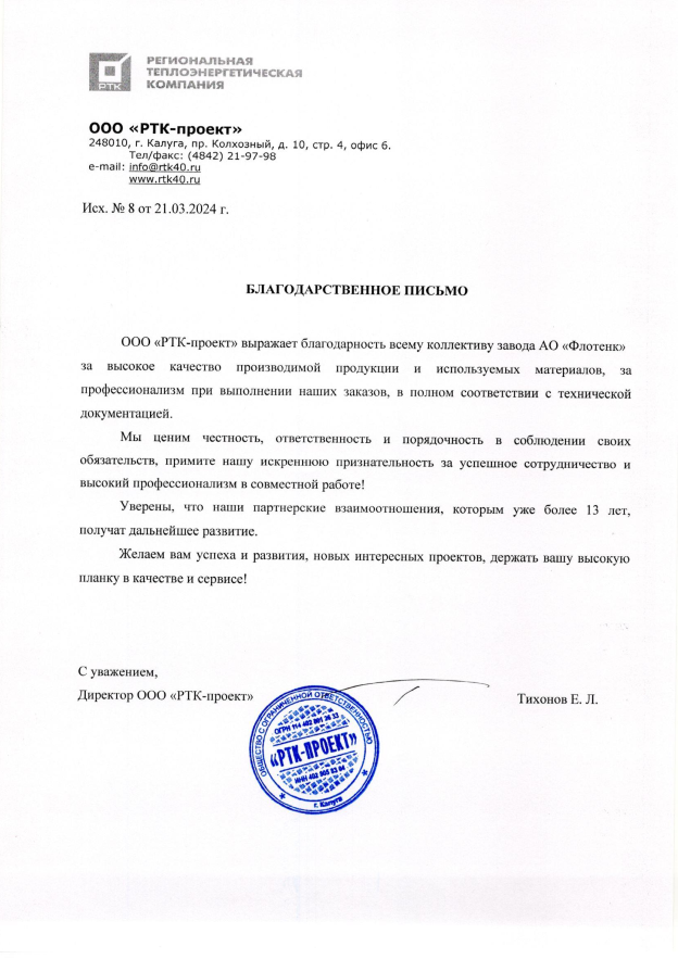Благодарственное письмо ООО РТК-проект