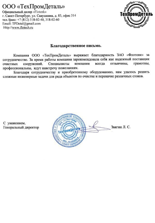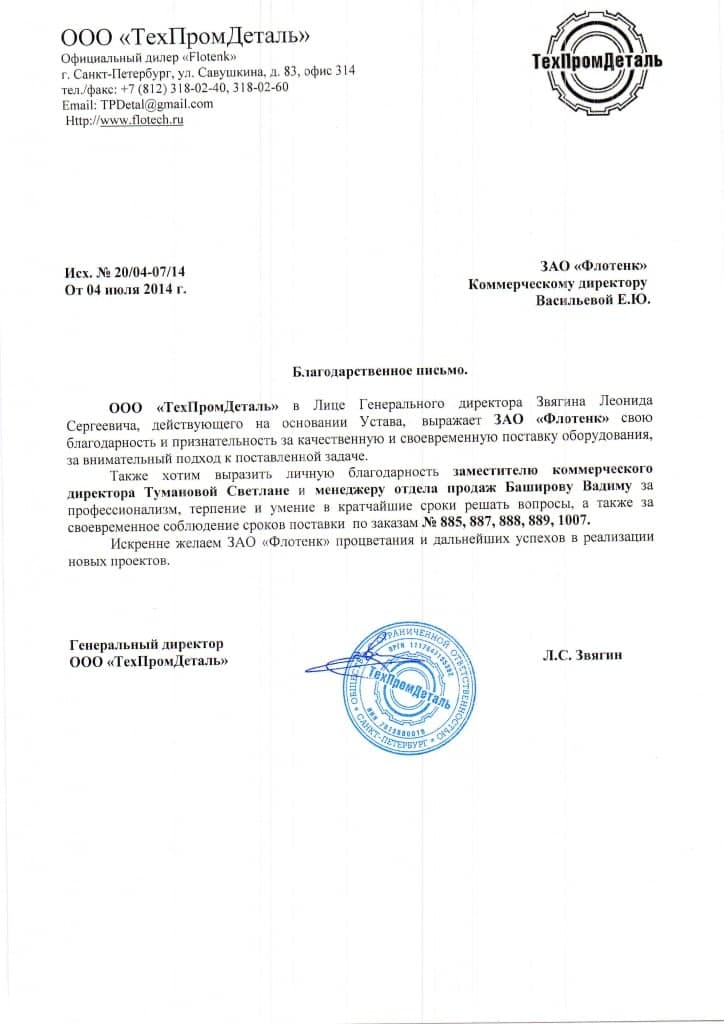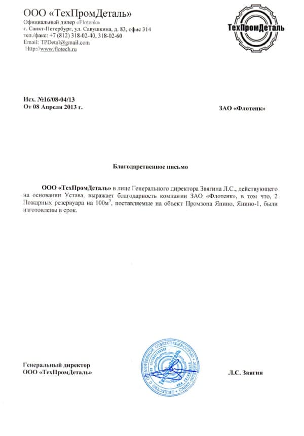 Рекомендательное письмо ООО "ТехПромДеталь"