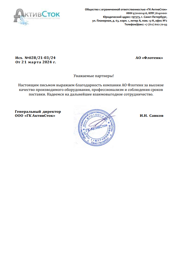 Благодарственное письмо ООО ГК АктивСток