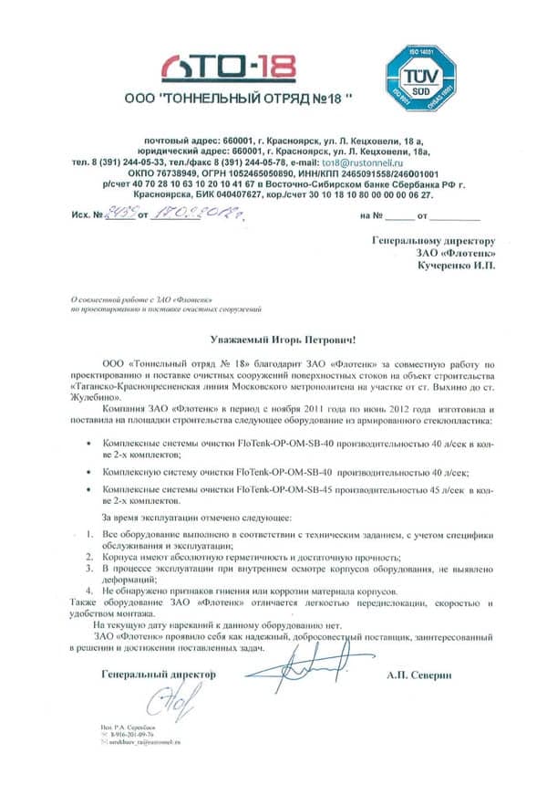 Рекомендательное письмо ООО "ТО-18"