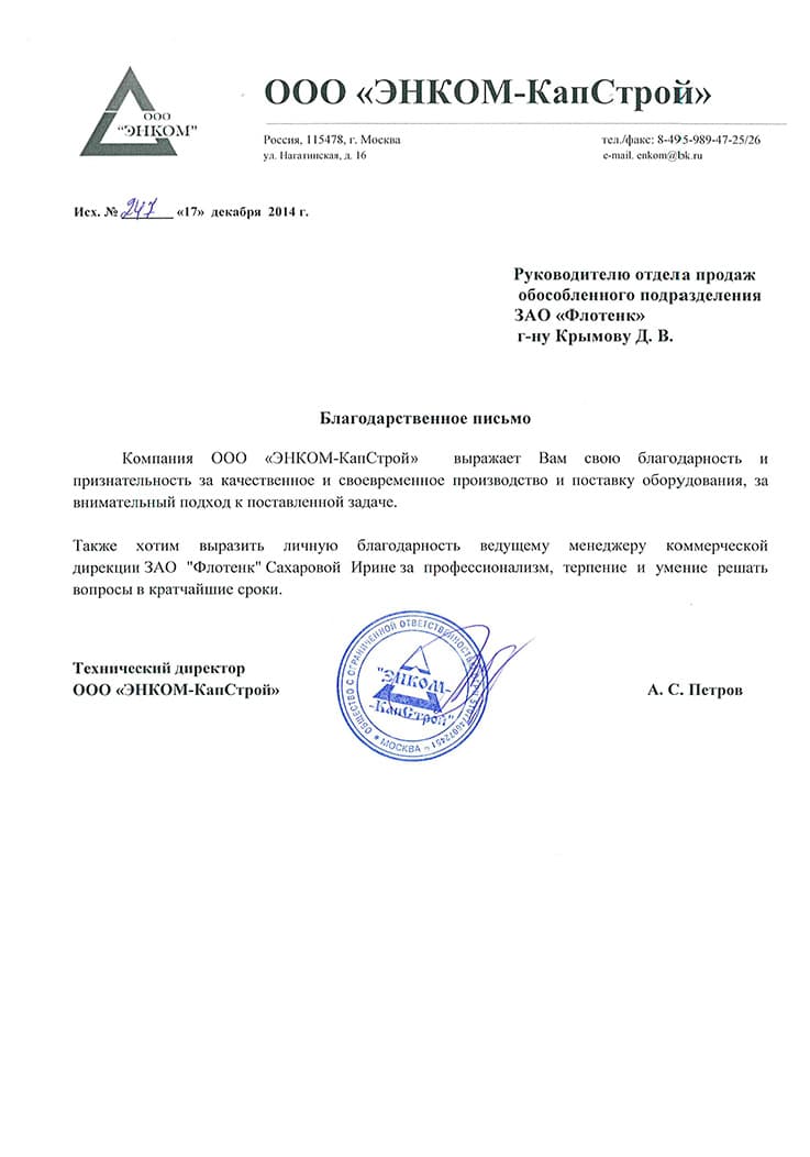 Рекомендательное письмо ООО  "ЭНКОМ-КапСтрой"