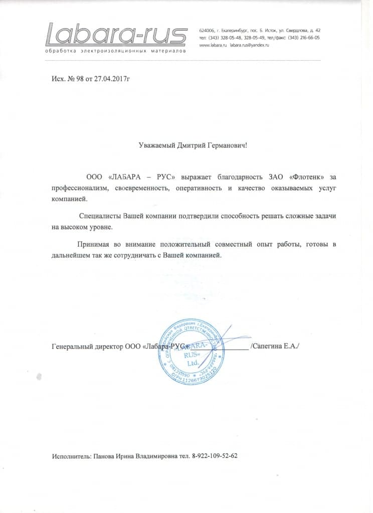 Рекомендательное письмо ООО "Лабара-РУС"