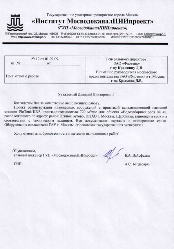 Рекомендательное письмо ГУП "МосводоканалНИИпроек"