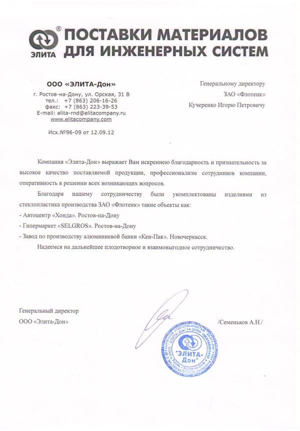 Рекомендательное письмо ООО "ЭЛИТА-Дон"