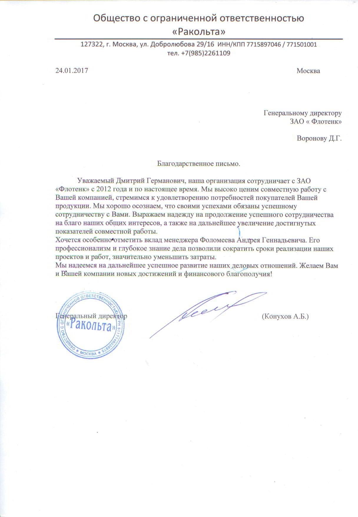 Рекомендательное письмо ООО "Ракольта"