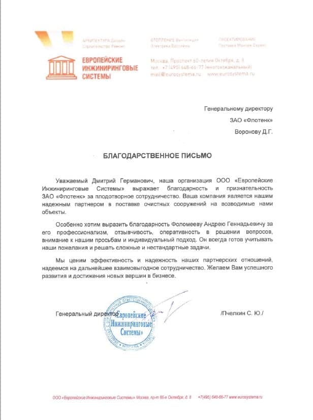 Рекомендательное письмо ООО "Европейские Инжиниринговые Системы"