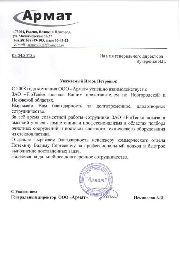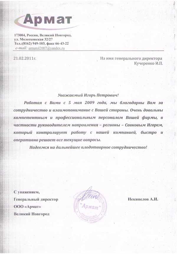 Рекомендательное письмо ООО "Армат"