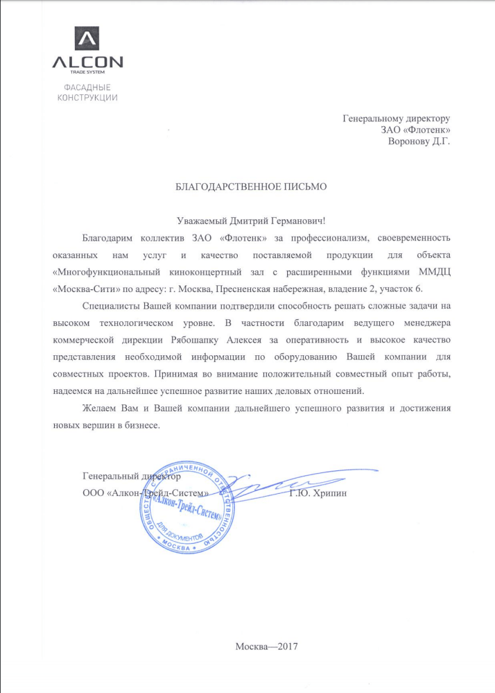 Рекомендательное письмо ООО "Алкон-Трейд-Систем"