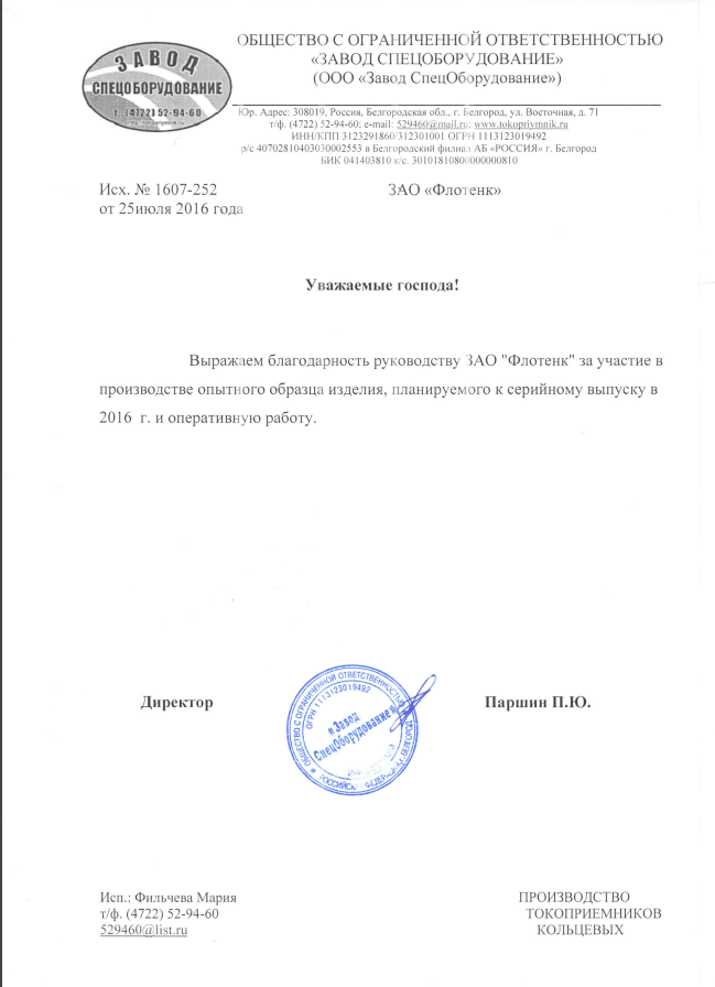 Рекомендательное письмо ООО "Завод СпецОборудование"