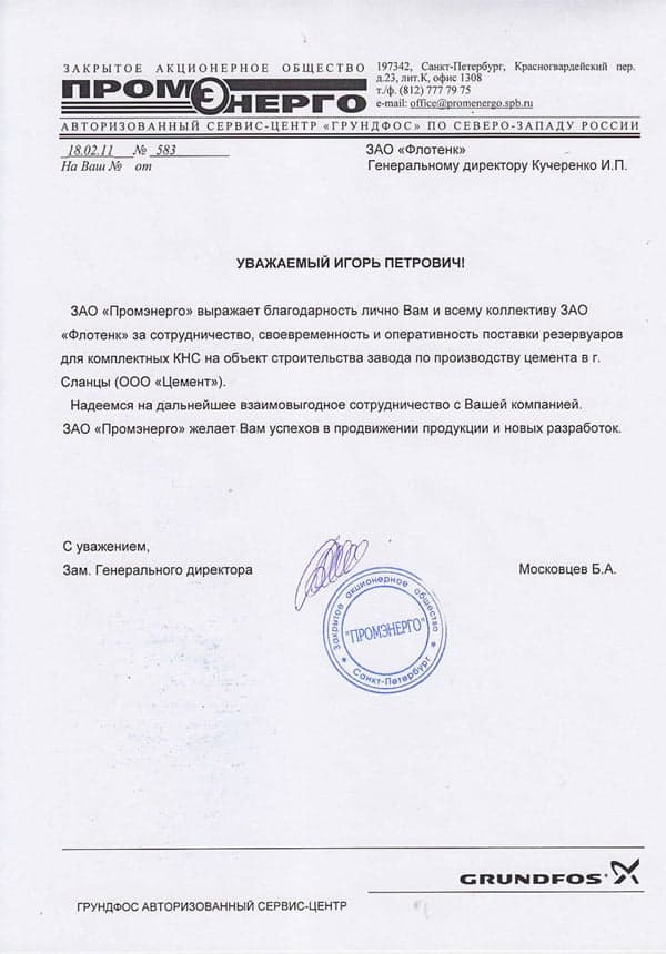 Рекомендательное письмо ЗАО "ПРОМЭНЕРГО"