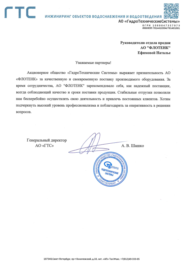 Рекомендательное письмо Благодарственное письмо АО ГидроТехническиеСистемы