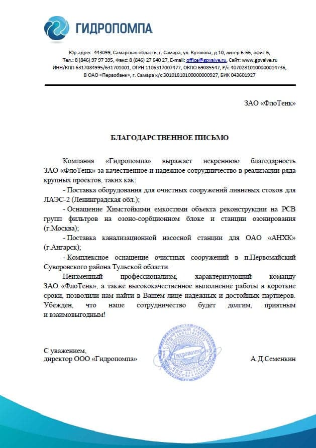 Благодарственное письмо АО ГидроТехническиеСистемы