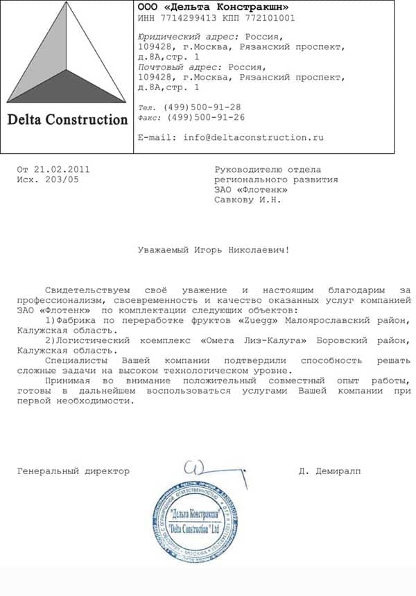 Рекомендательное письмо ООО "Дельта Констракшн"