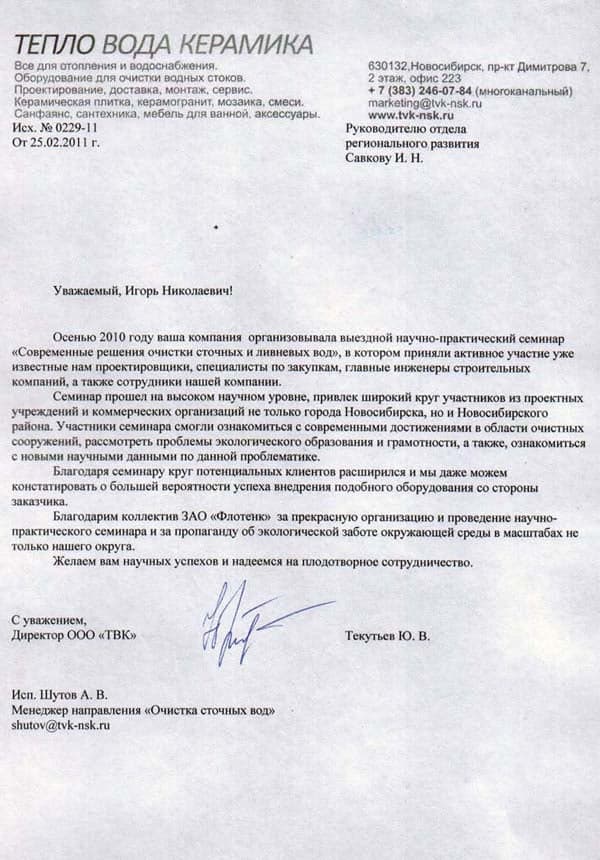 Рекомендательное письмо ООО "ТВК"
