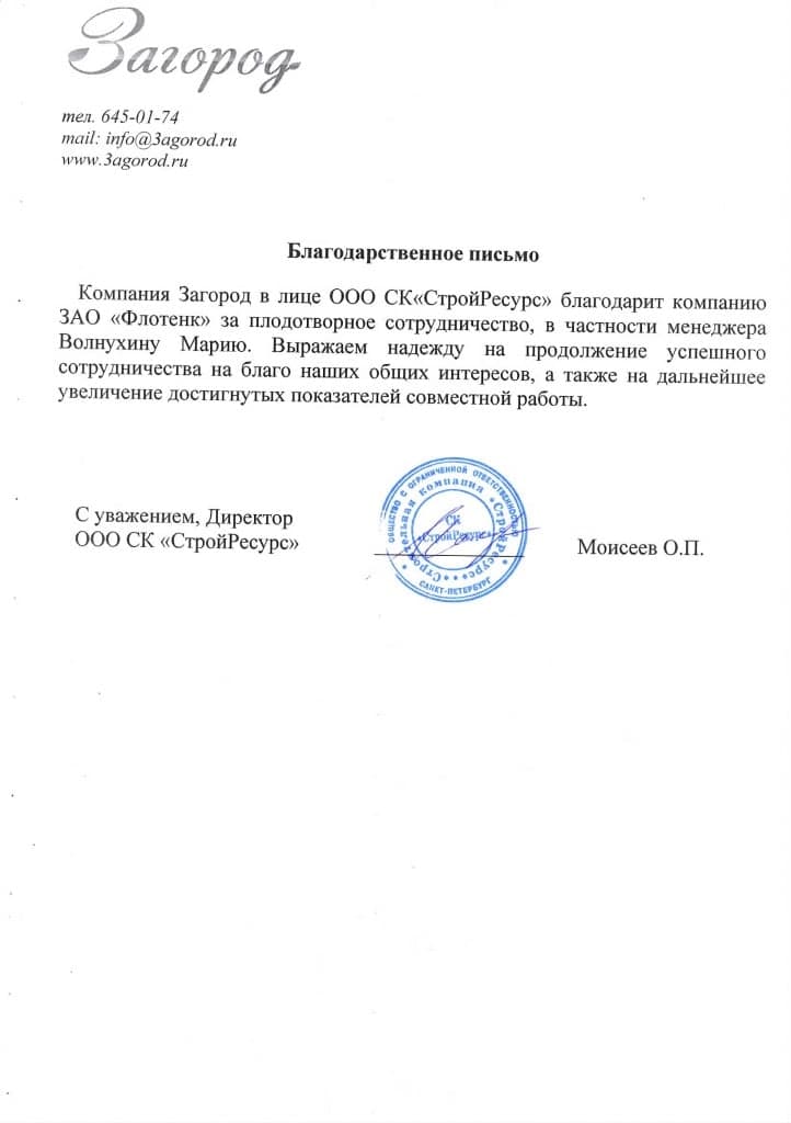Рекомендательное письмо ООО СК "СтройРесурс"