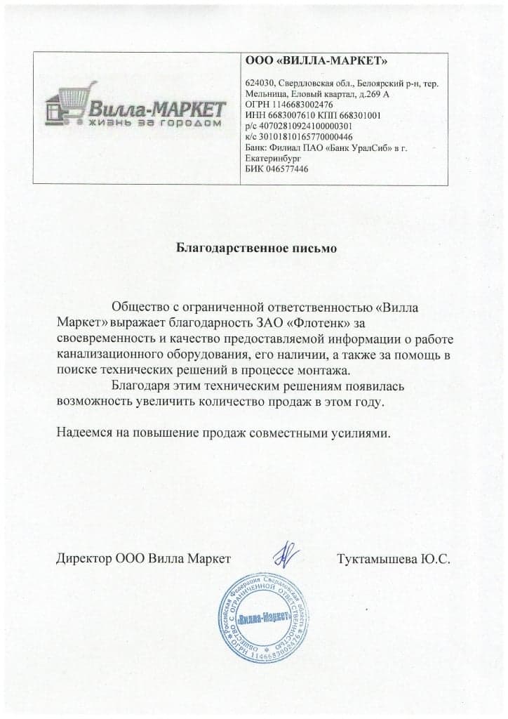 Рекомендательное письмо ООО "Вилла-Маркет"
