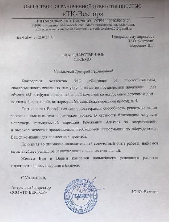 Рекомендательное письмо ООО "ТК-Вектор"