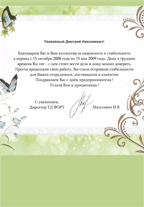 Рекомендательное письмо ТД "ФОРТ"