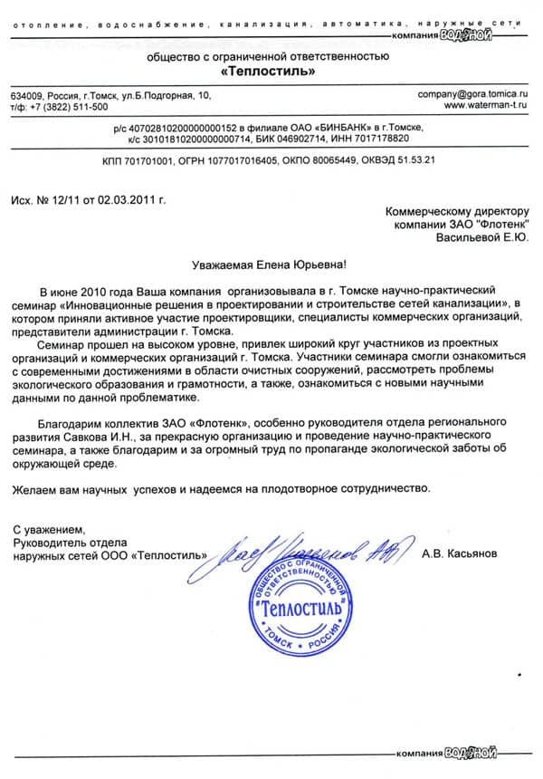 Рекомендательное письмо ООО "Теплостиль"
