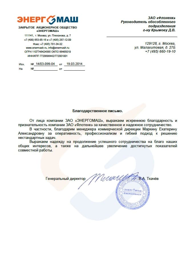 Рекомендательное письмо ЗАО "ЭНЕРГОМАШ"