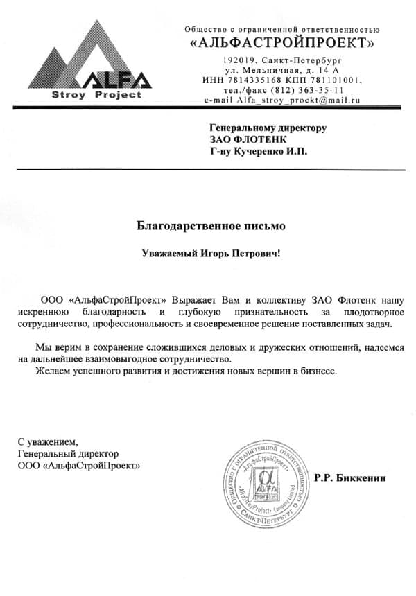 Рекомендательное письмо ООО "Альфастройпроект"