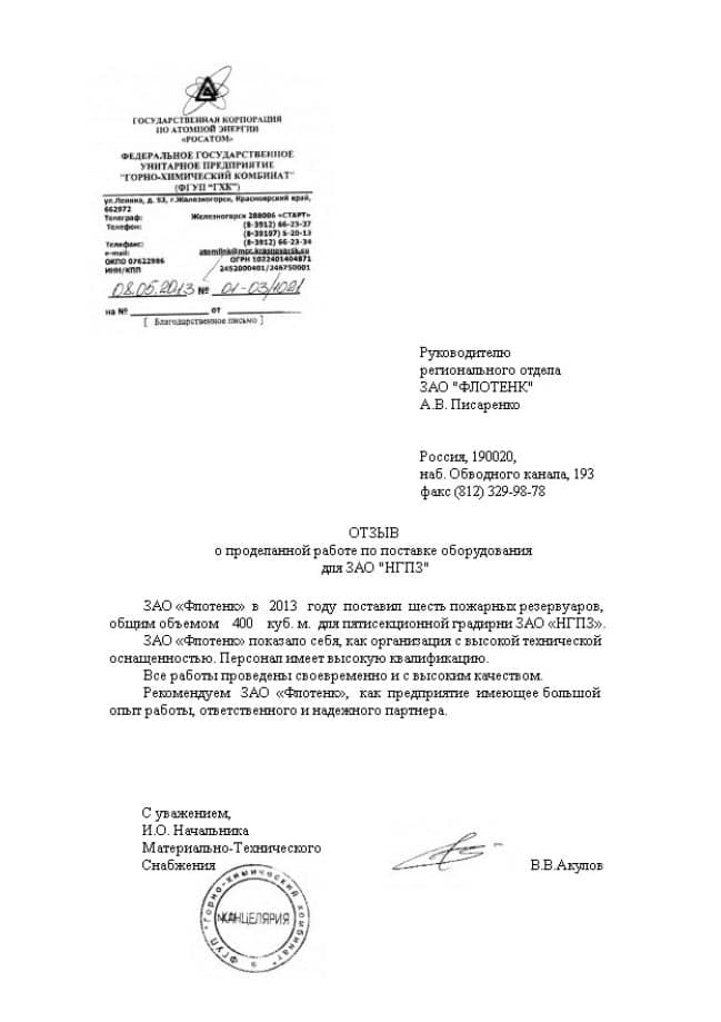Рекомендательное письмо ФГУП "ГХК"