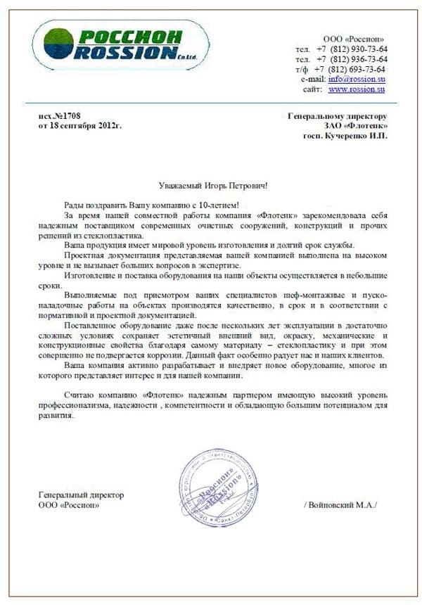 Рекомендательное письмо ООО "Россион"