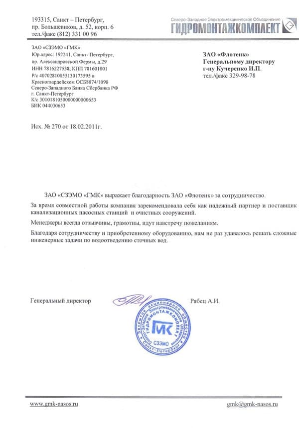 Рекомендательное письмо ЗАО СЗЭМО "ГМК"
