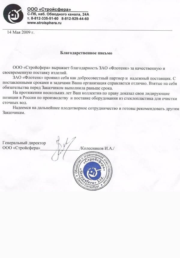 Рекомендательное письмо ООО "Стройсфера"