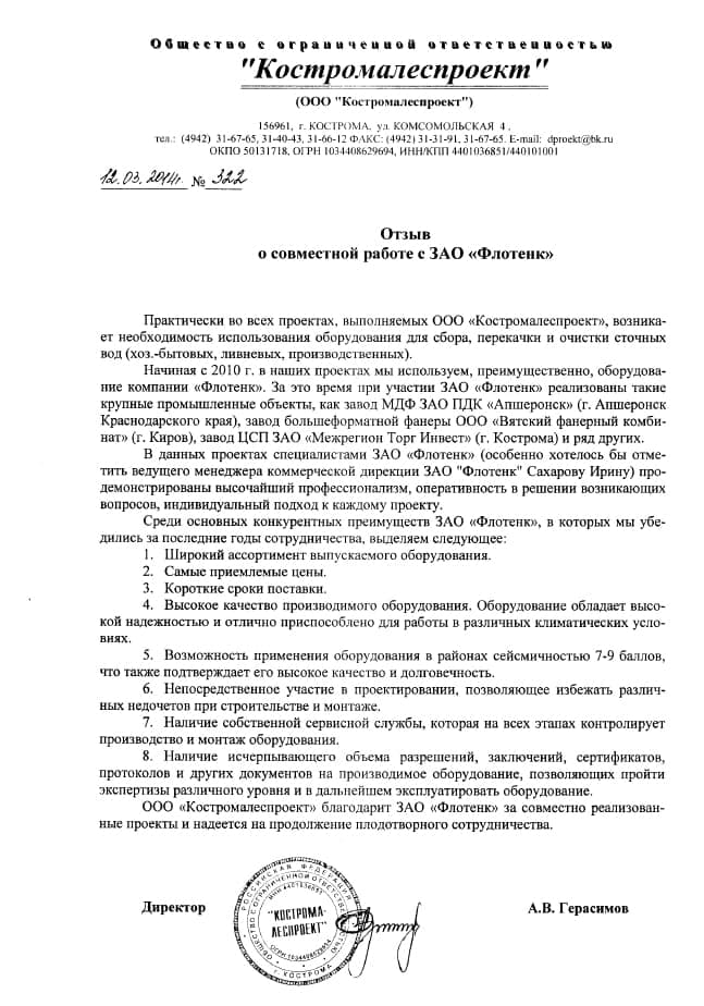 Рекомендательное письмо ООО "Костромалеспроект"