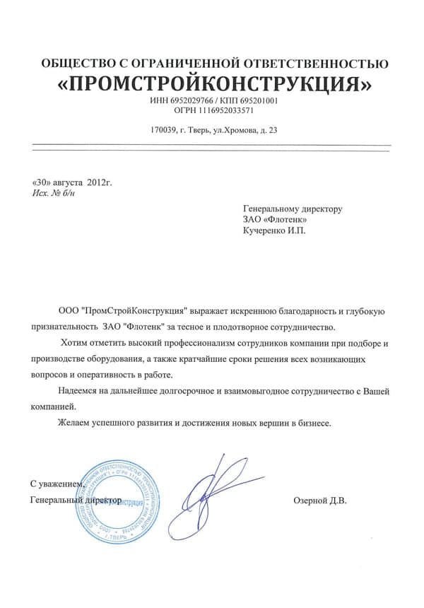 Рекомендательное письмо ООО "ПРОМСТРОЙКОНСТРУКЦИЯ"