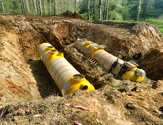 Данный тип установки рекомендуется к рассмотрению при отсутствии возможности полного заглубления (вечная мерзлота), но так же при отсутствии требований к мобильности. Комплексная система очистки устанавливается на плиту классическим способом (как при подземной установке), а незаглубленная часть обсыпается песком. Как правило, при таком виде установки требуется дополнительно утеплять резервуар, а при больших диаметрах необходимо применять усиленные корпуса.