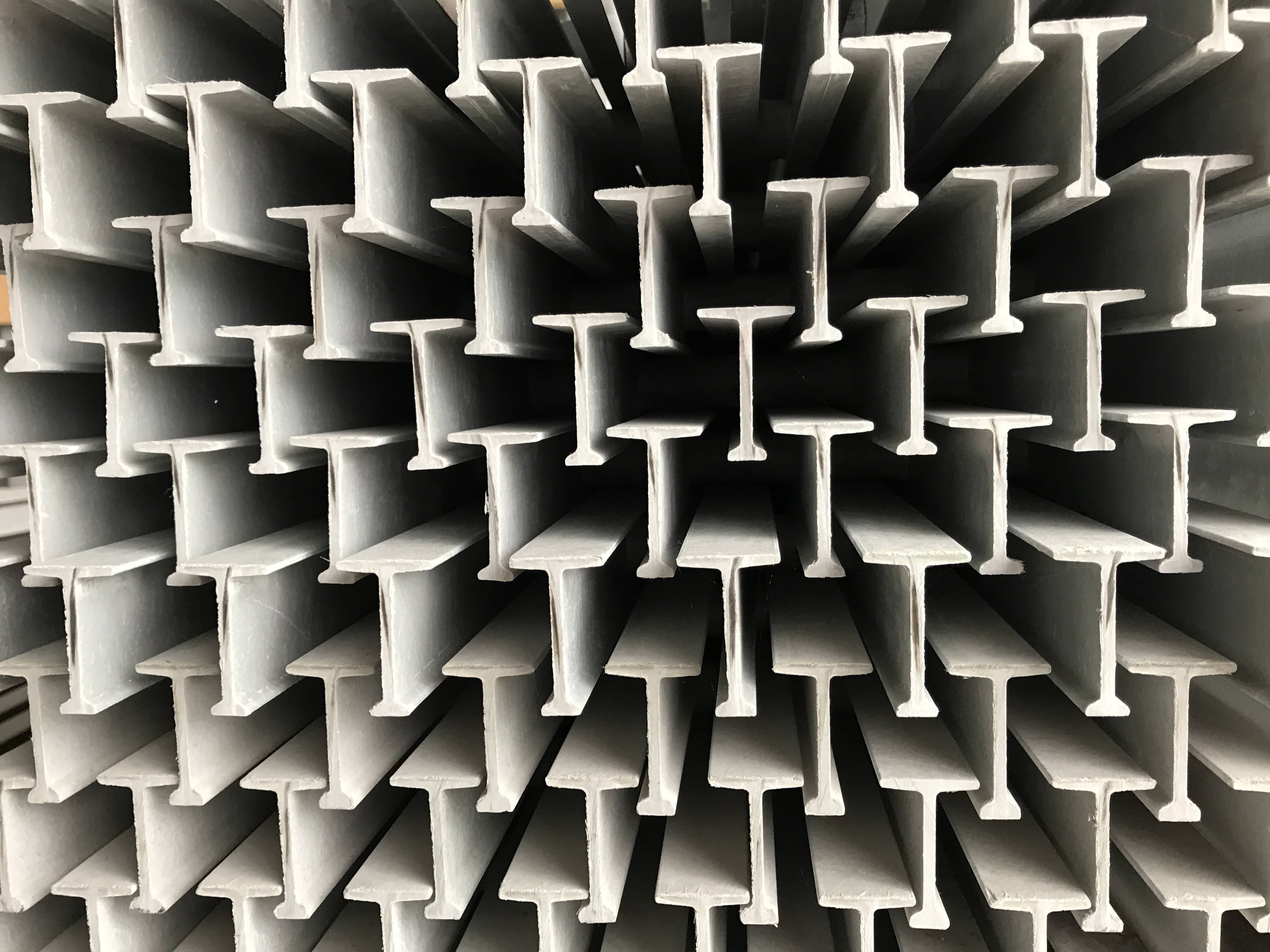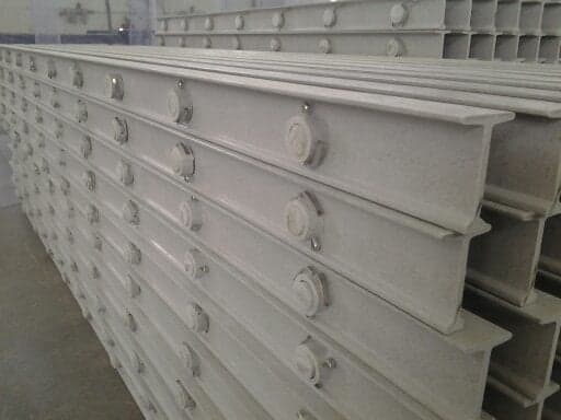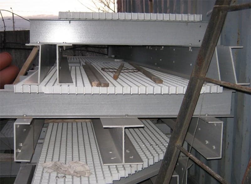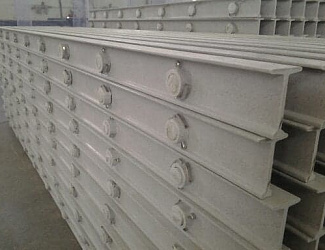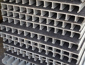 Стеклопластиковый профилированный настил состоит из отдельных деталей, имеющих очертания двутавров, которые скреплены между собой поперечными элементами.