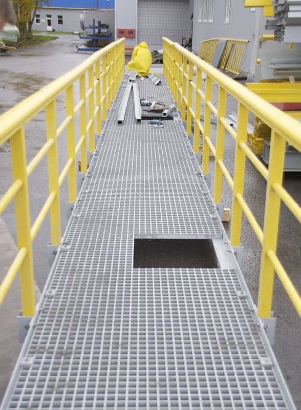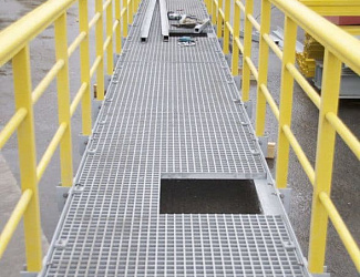 Прочные и легкие, сплошные настилы активно используются при создании лестниц, переходов, площадок и других сооружений. Для противоскольжения и повышения износостойкости возможен вариант исполнения с корундовой крошкой.